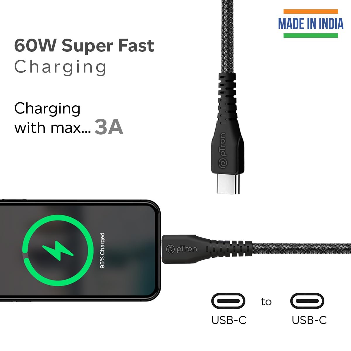 Introducing pTron Solero Braid, a durable and fast-charging data cable designed to outlast your device. This Type-C to Type-C cable supports up to 60W (3A max.) power output for quick charging and offers 480 Mbps data transfer speed. It features built-in protection against short circuits and voltage fluctuations and high-resistance insulation for efficient charging. The 1.5-meter-long cable is perfect for charging and syncing your smartphone, tablet, PC peripherals, and other Type-C devices. Backed by a 6-month manufacturer warranty against manufacturing defects, it is a reliable choice for your charging needs. Contact customer care at Support@ptron.in or 040-67138888.