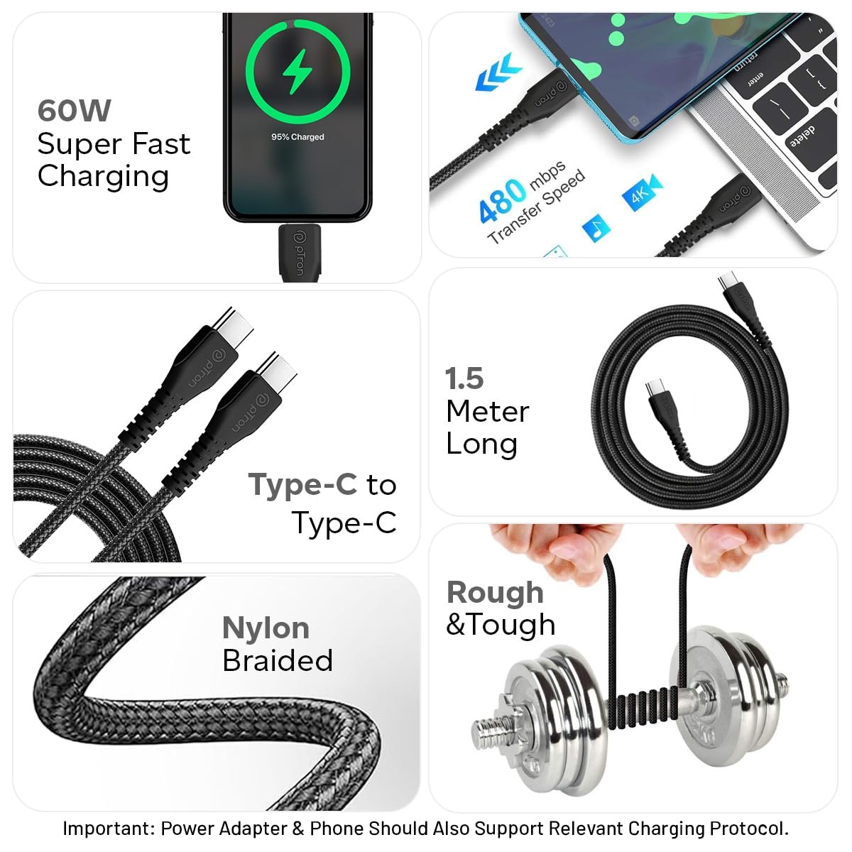 Cable Supports Quick Charger 3.0/2.0, Super VOOC, VOOC, WARP & DASH charging protocols | Important: Power Adapter & the Device Sholuld also Support These Protocols for Effective Charging.