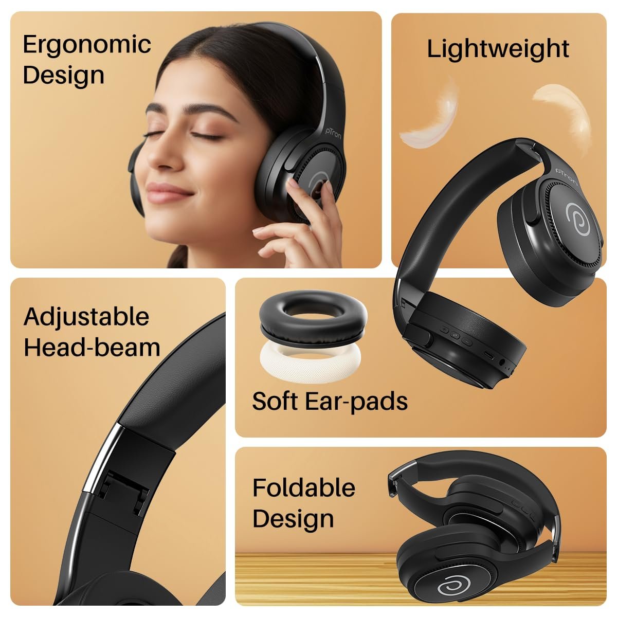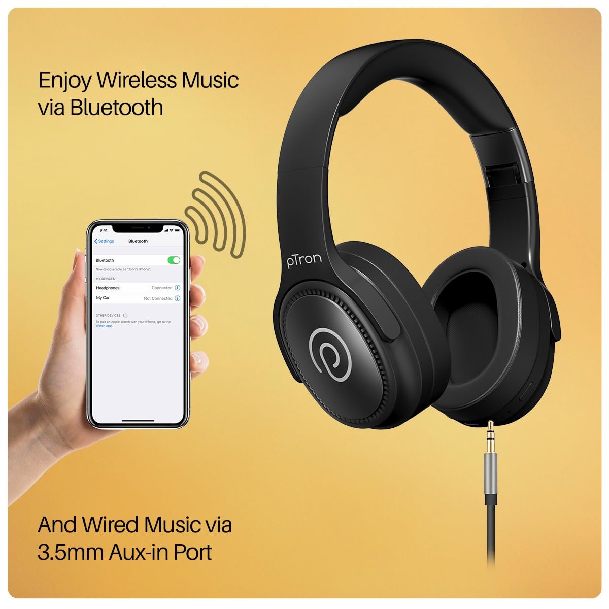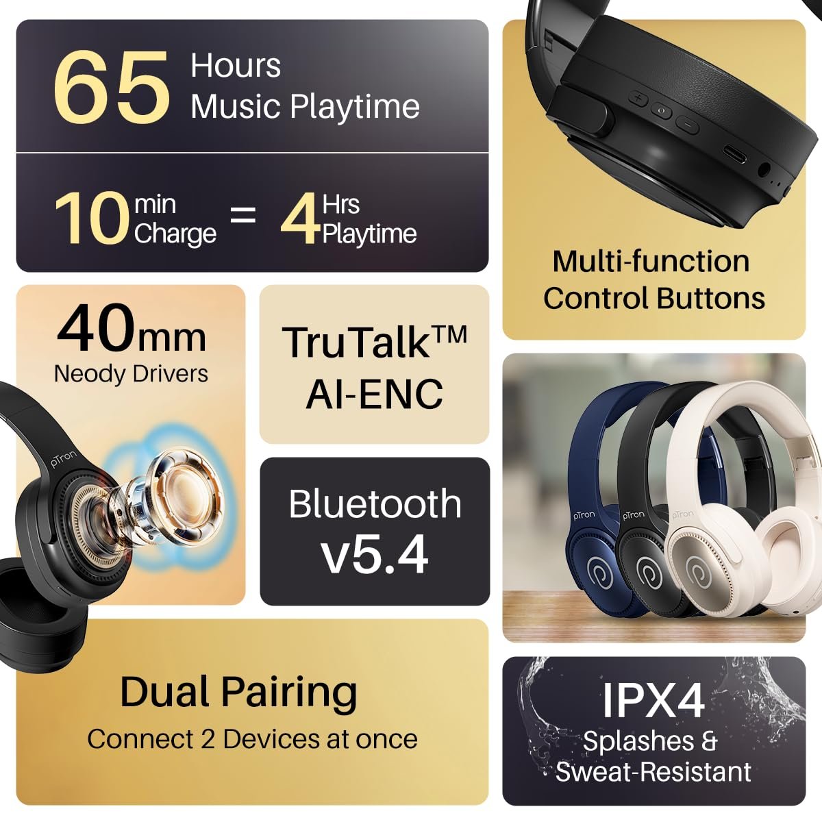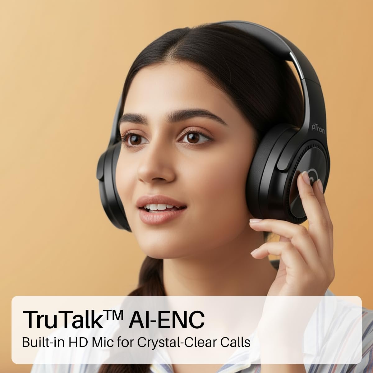 pTron Studio Pro w/ 65Hrs Playtime, Wireless Over Ear Headphones w/HD Mic & AI-ENC, Low-Latency Game & Music, 40mm Drivers, BT5.4, Dual Device Pairing, Voice Assist. & Type-C Fast Charging(Jet Black)