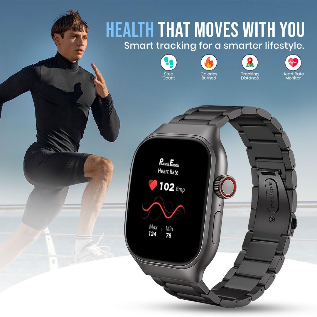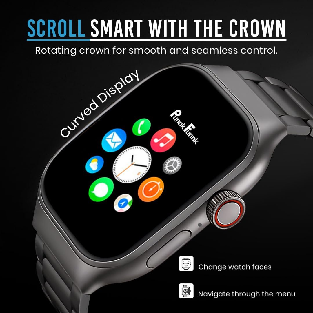 PunnkFunnk Newly Launched Fitrivo SmartWatch 2.01″ Curved AMOLED Display, 100+ Watch Faces, Crown Control, 100+ Sports Modes, Health Tracking, Bluetooth Calling, IP67, for Men & Women (Metal Black)