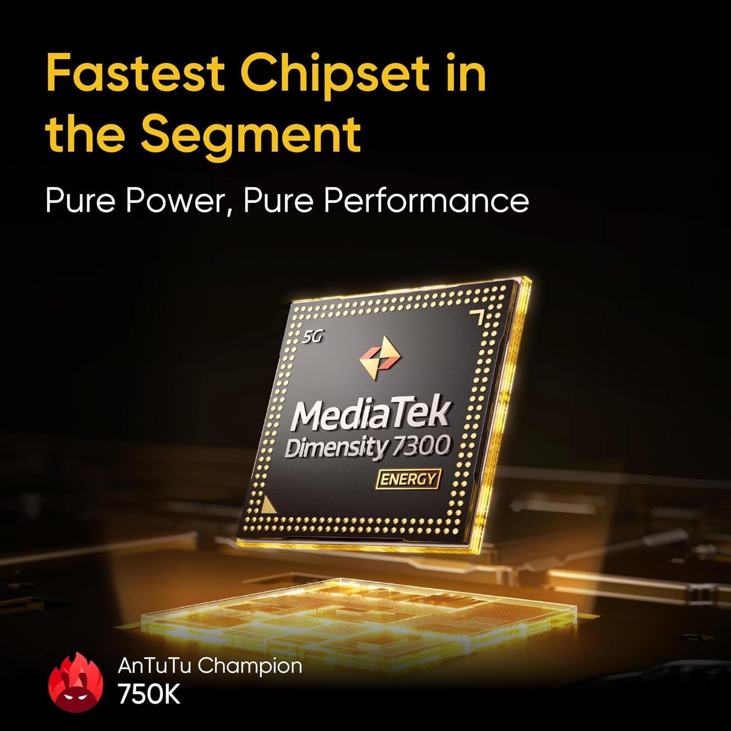 Dimensity 7300 Energy 5G Chipset, Fastest chipset in this segment, dominate your games with an unprecedented 750000 AnTuTu score,AI BOOST 2.0,Turbo ahead with up to 40% smoother performance.
