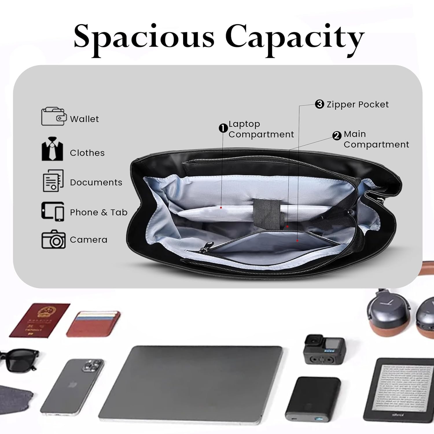 Spacious backpack capacity holds essentials, gadgets, books, clothes, and travel gear efficiently.
