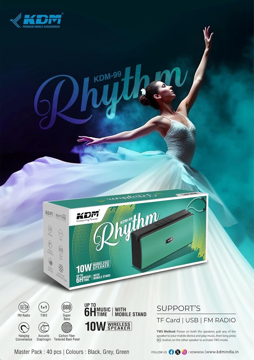 Elevate your audio experience with the KDM-99 Rhythm wireless speaker, designed to deliver powerful sound wherever you go. This sleek black speaker features advanced V5.3 wireless technology for seamless connectivity and boasts a dual 5W*2 output with Super Bass that brings your music to life. Enjoy up to 6 hours of continuous playback on a single charge, powered by a robust 1200mAh battery that fully charges in just 90 minutes via Type-C fast charging. The KDM-99 Rhythm offers versatile functionality with FM radio support and 1+1 TWS capability, allowing you to pair two speakers for an immersive stereo experience. With a 10-metre transmission distance, you can move freely whilst staying connected. The built-in mobile stand adds practical convenience, making it perfect for video calls or watching content hands-free. The hanging design provides additional portability options, whether you’re at home, in the office, or outdoors. This feature-packed wireless speaker combines style, functionality, and impressive audio performance in one compact package.