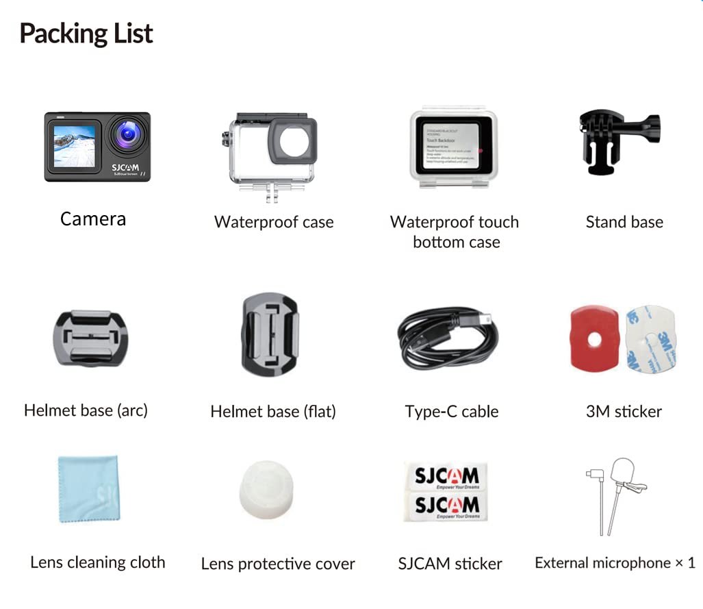 Package Include:- 1 x Camera, 1 x SJ8 Mic, 1 x Waterproof Housing, 1 x Waterproof touch bottom case, 1 x Stand Base, 1 x Helmet base (arc), 1 x Helmet base (flat), 1 x Type-C cable, 2 x 3M Adhesive Tape, 1 x Cleaning Cloth, 1 x Quick Guide, 2 x SJCAM Sticker, 1 x Lens protective cover