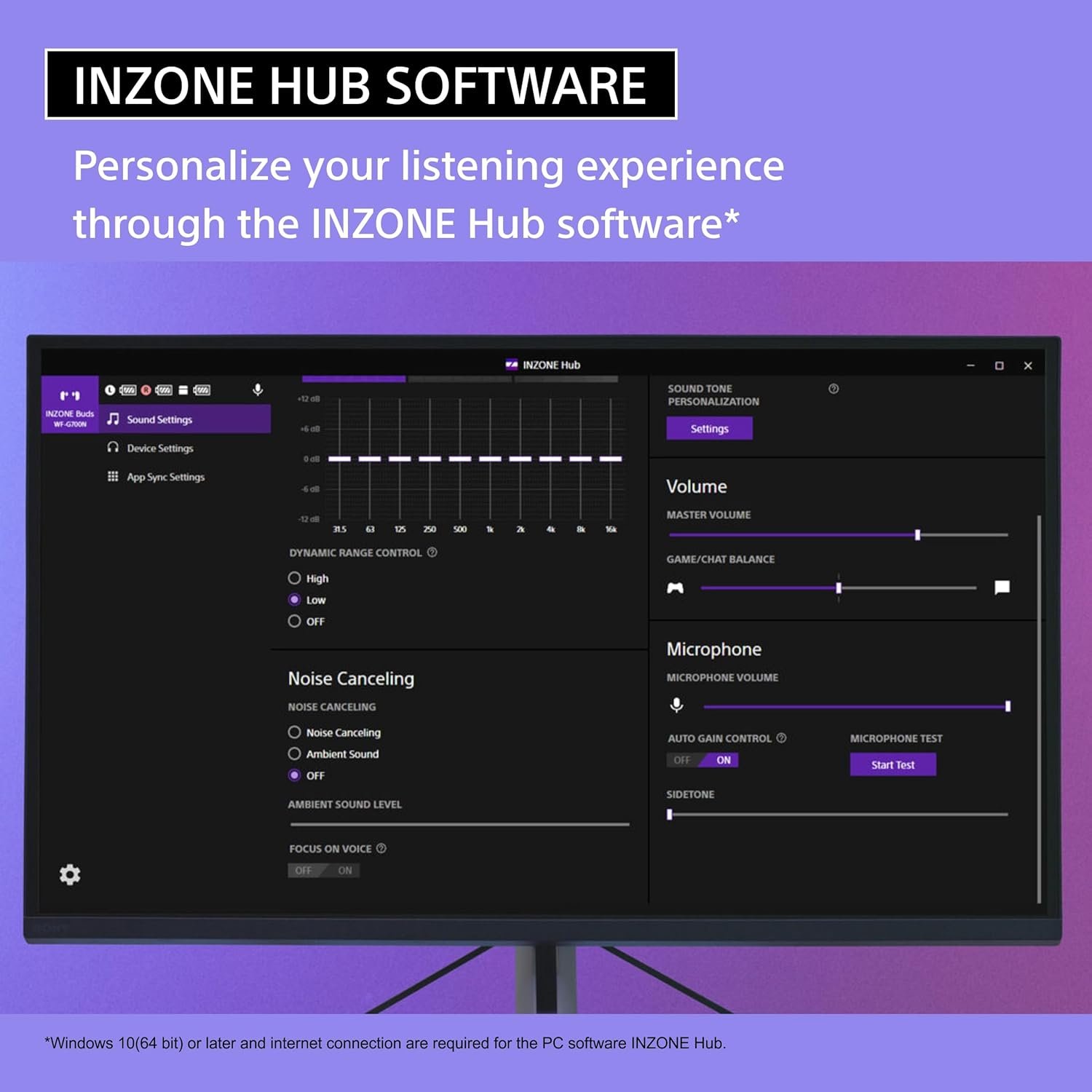 The INZONE Hub PC software includes a wide range of sound and hardware settings, and you can even fine-tune sound frequencies to your liking.