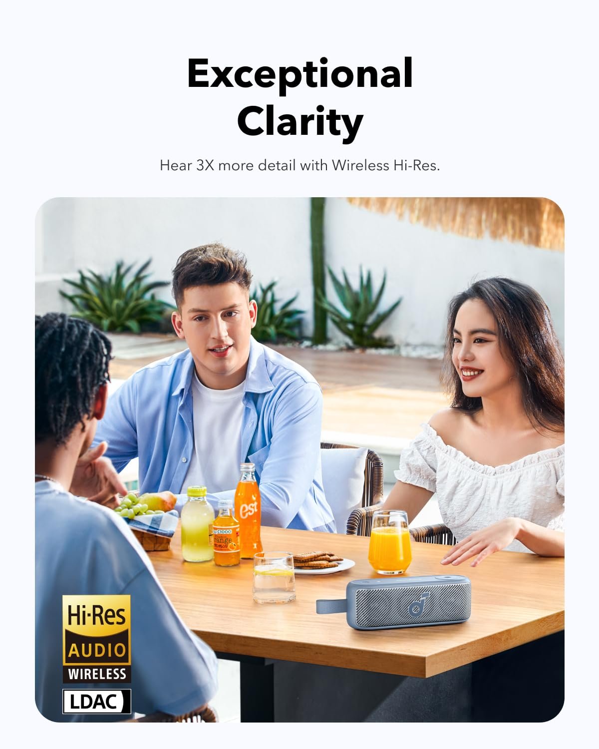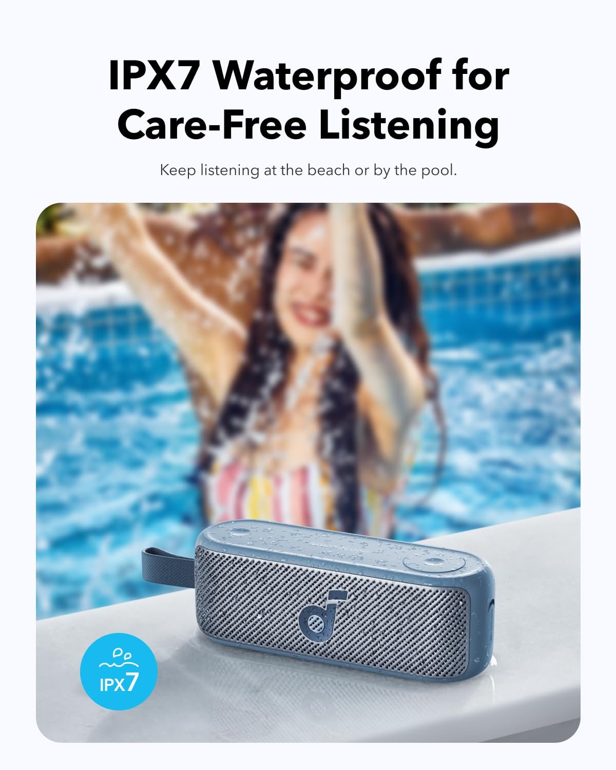 IPX7 Waterproof: Whether you’re by the pool or at the beach, keep listening without limitations thanks to the IPX7 waterproof rating.