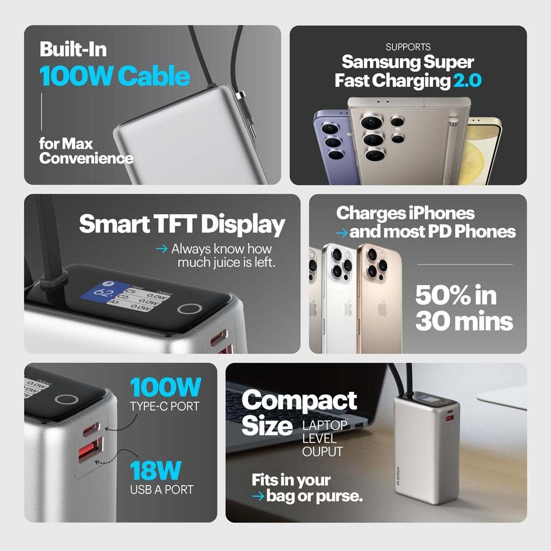 [No Extra Cable? No Problem.]:Charge your MacBook 14″”/16″”, iPhone, Pixel, DSLR, Nintendo Switch, and more — all using the in-built 100W cable. No untangling, no carrying spares — just plug in and power up in seconds.