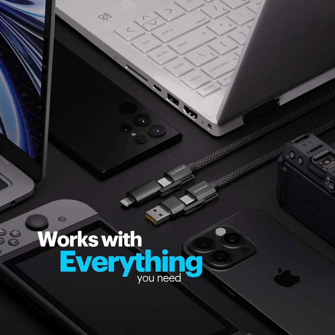 [The Only Cable You’ll Ever Need!]:Elevate your charging game with the Quad Pro Black – the ultimate 4-in-1 cable that does it all! With up to 100W power delivery, powered by an advanced E-marker chip, this cable charges your devices faster and better. The 1.5-meter length offers unmatched convenience, while longer pins ensure a flawless, secure connection every time. Built to last with durable aluminum housing and premium nylon braiding, it’s designed for performance and durability. Need speed? Enjoy fast 480 Mbps data transfers without a hitch.