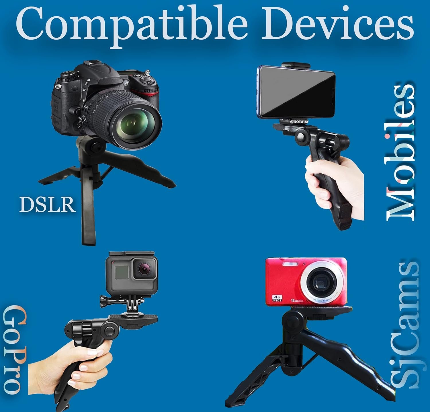 Widely Compatible: The pistol grip tripod built-in universal 1/4-20 screw for small DSLR, like Canon EOS M Series, 200D, 600D 5D2, Sony NEX-5N, NEX-6, NEX7, NEX Series, Panasonic GH1 GH2 GF Series, Nikon, GoPro etc. It also comes with a universal clip for most of smart phone with width between 2.16~3.34 inch (5.5~8.5cm), such as iPhone Xs Max/Xs/XR/8/7 plus, Galaxy Note 10 plus/Note 10/9/8, S10/9/8/plus and more.