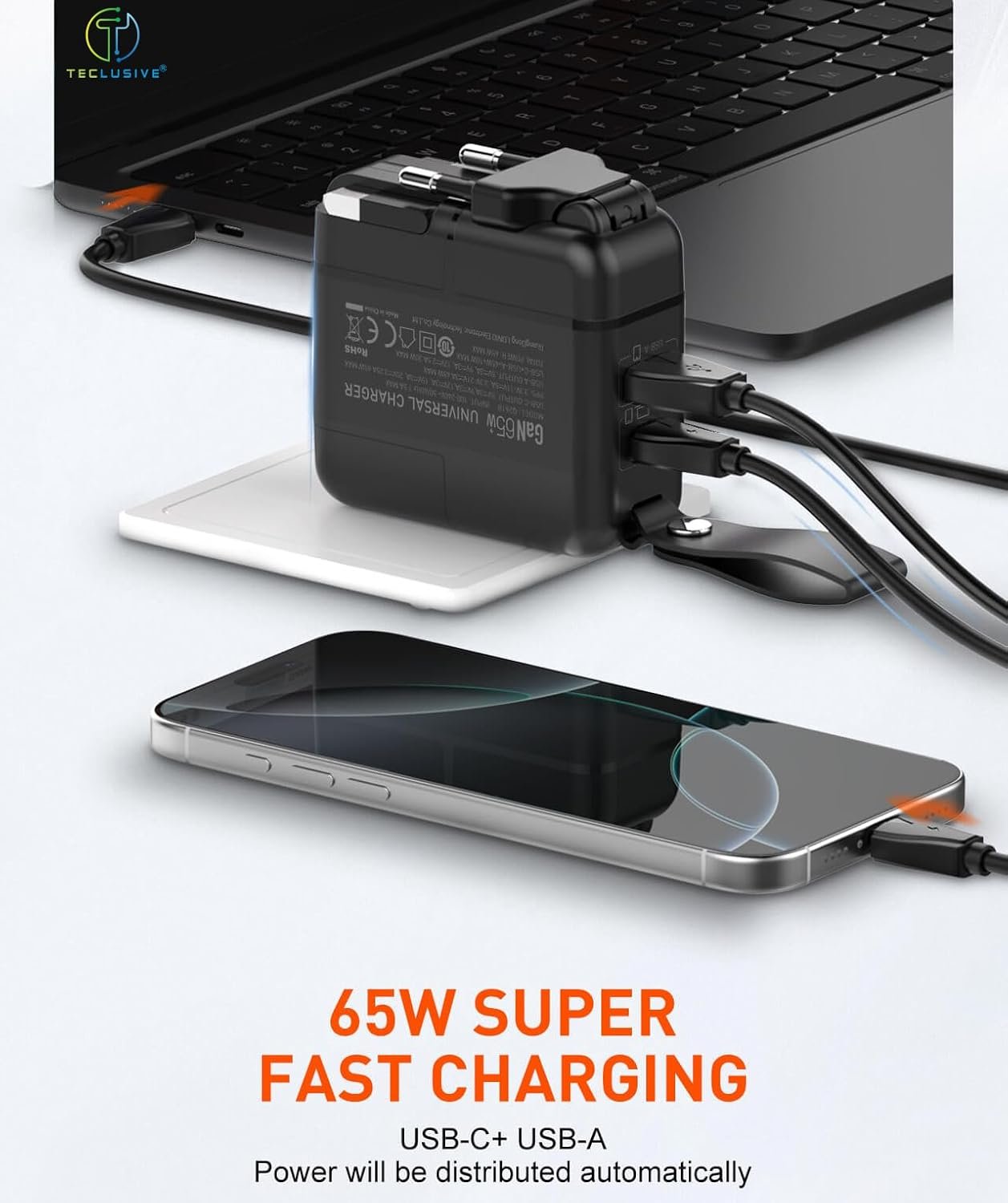 T Teclusive 65W Gan Charger Type C Compatible with iPhone 16 15 Galaxy S25 S24 Ultra MacBook Air Pro Laptop | EU UK US AU World Plug with PD QC USB C Super Fast Charging Travel Adapter