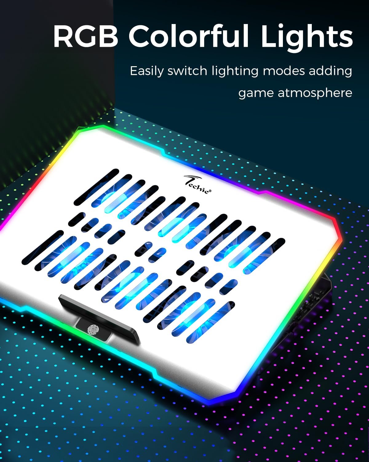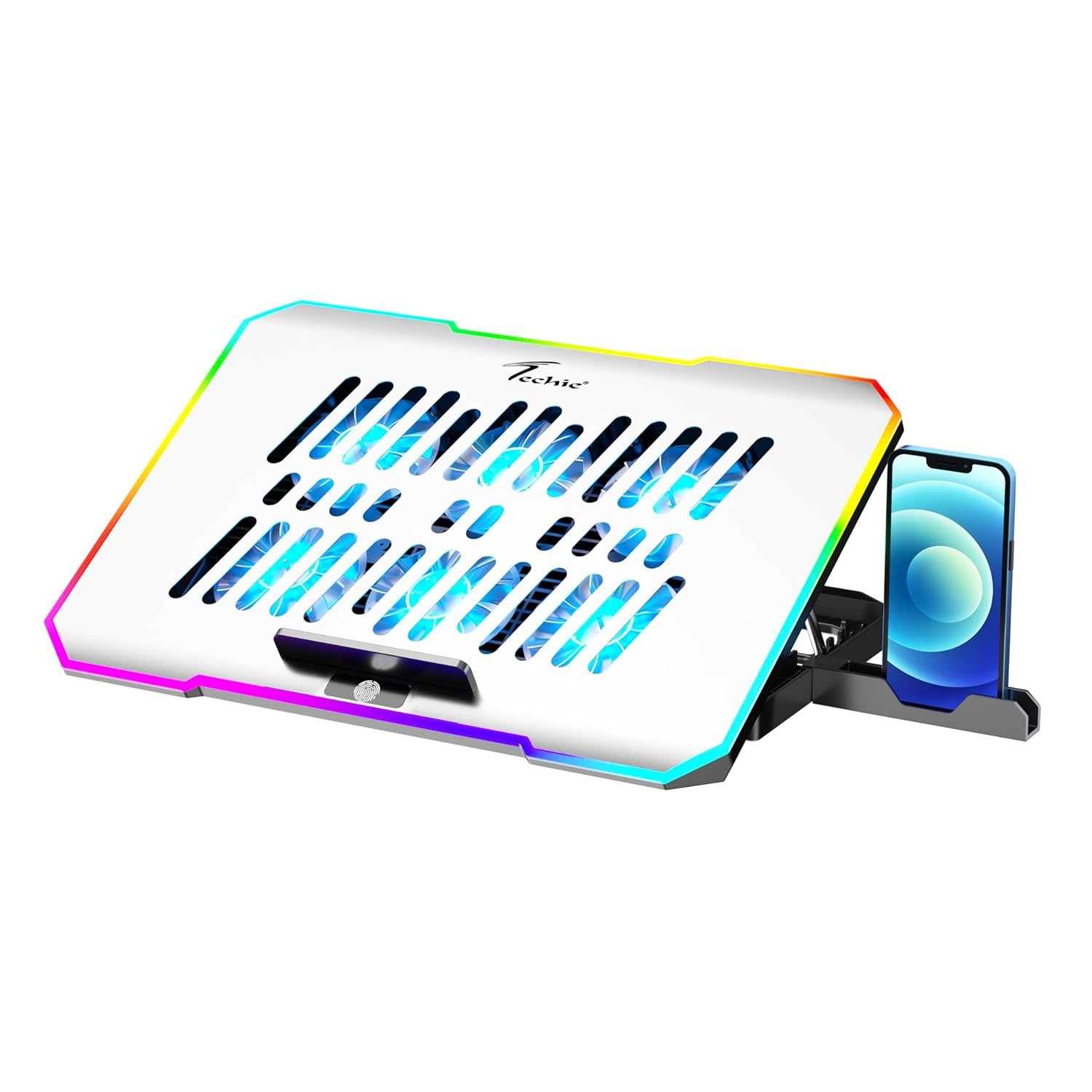 TECHIE 6 Fan Laptop Cooling Pad with Mobile Stand & 10 RGB Modes | 5-Level Adjustable Gaming Stand | Dual-Speed Fans 1200–3000 RPM | Quiet USB Cooling Base | Foldable Metal Mesh for 15.6″ Laptops