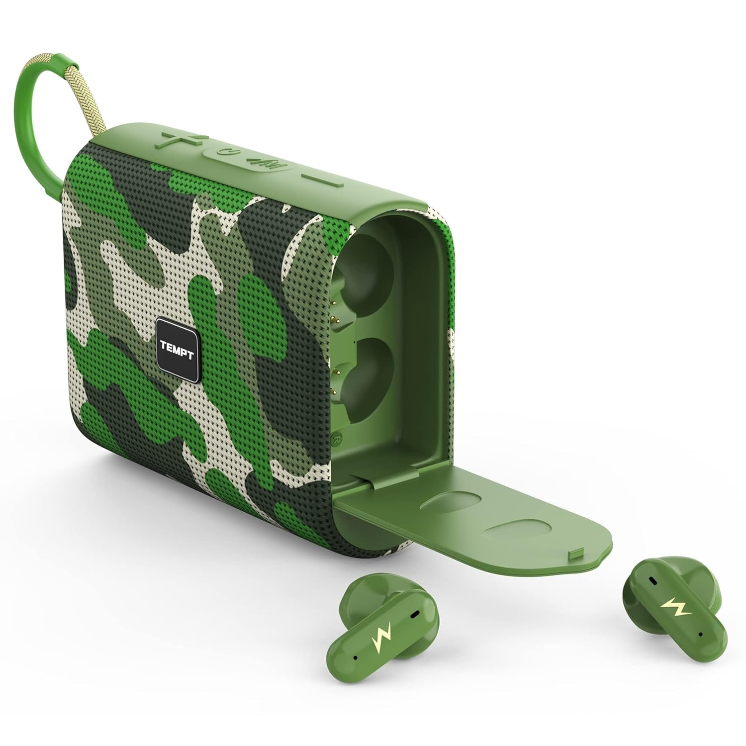 TEMPT Juggler Bluetooth Speaker with in-Built TWS Earbuds, 52mm Wireless Speaker Bass Drivers, 13mm Ear Buds Drivers, Type C Charging Jack, Lightweight & Portable Mini Soundbox, BT V5.3 (Army Green)