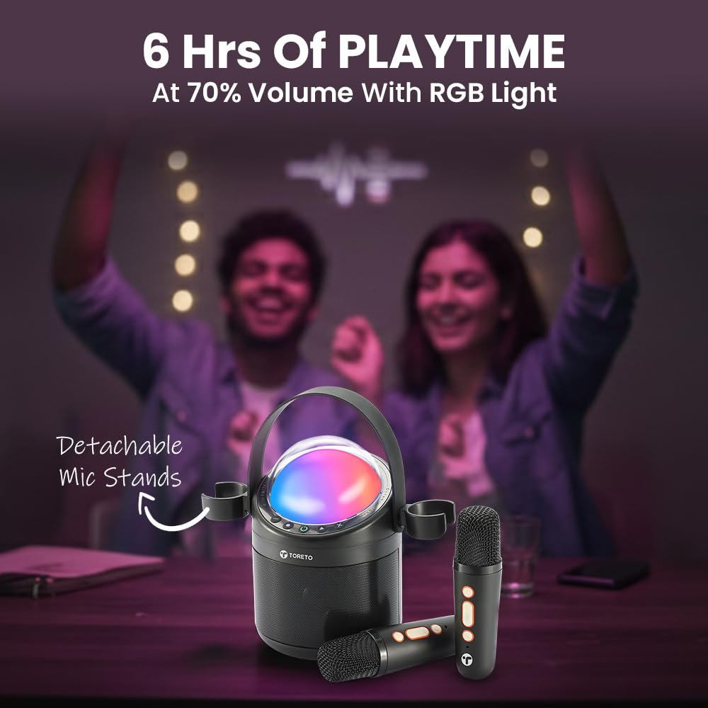 Toreto Glowbeat 20W Portable Karaoke Bluetooth Speaker with 2 Wireless Voice Changer Mics with Detachable Mic Stands, Party Glow Light, TWS, Selfie Mode, FM/USB/TF/AUX, Type-C Charging, 6H Playtime
