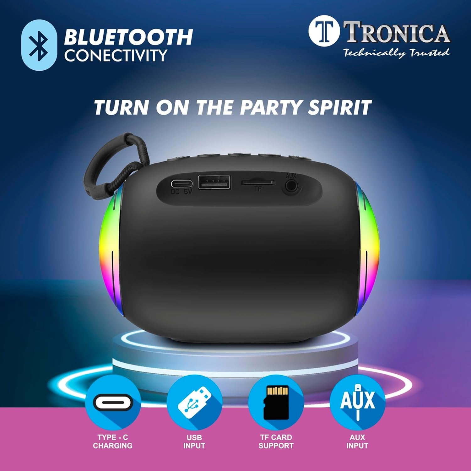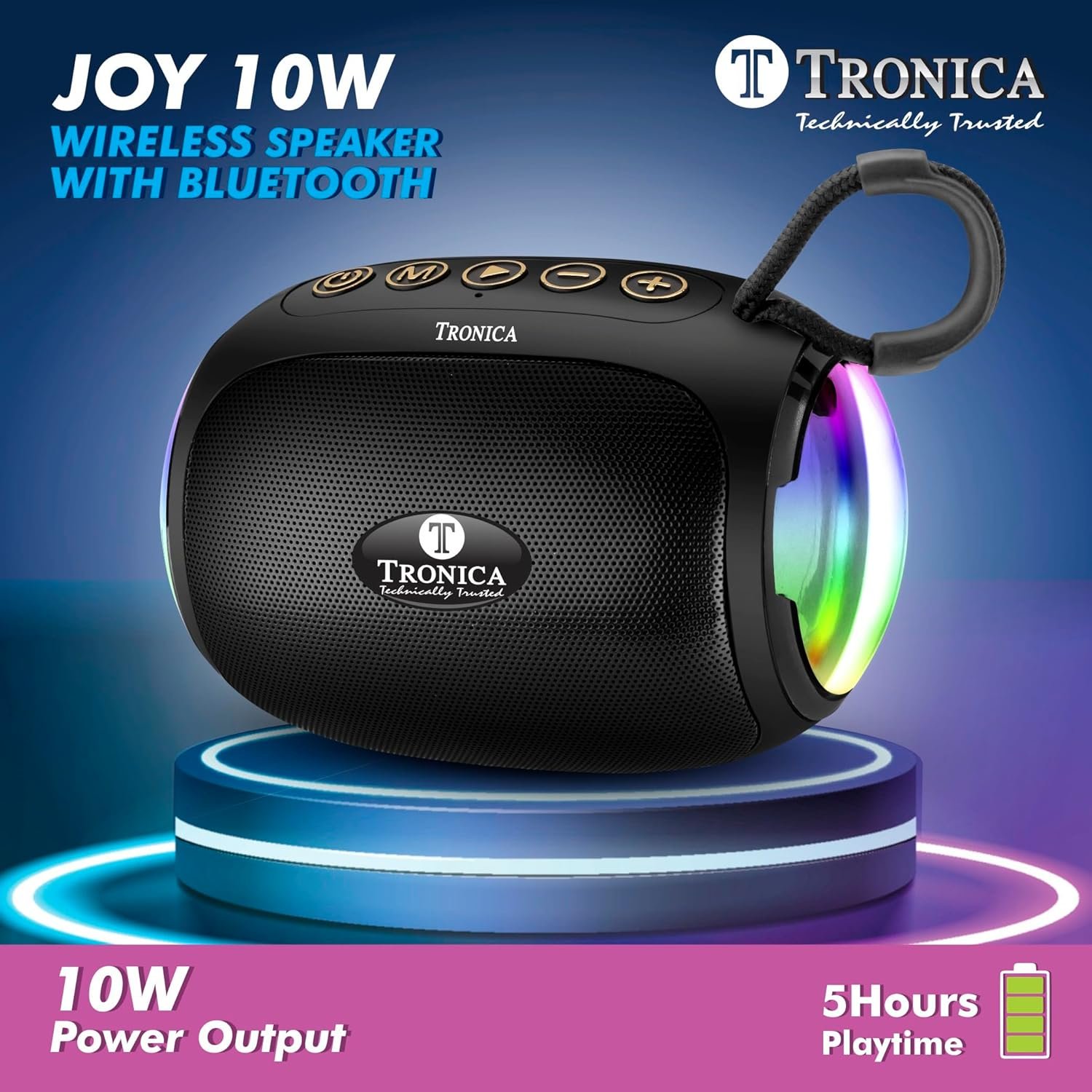 TRONICA Joy Portable Bluetooth 10W Speaker with LED Lights, Control Panel, Wireless Music Player,FM,Pen Drive,AUX 5hrs Non Stop Playback Black