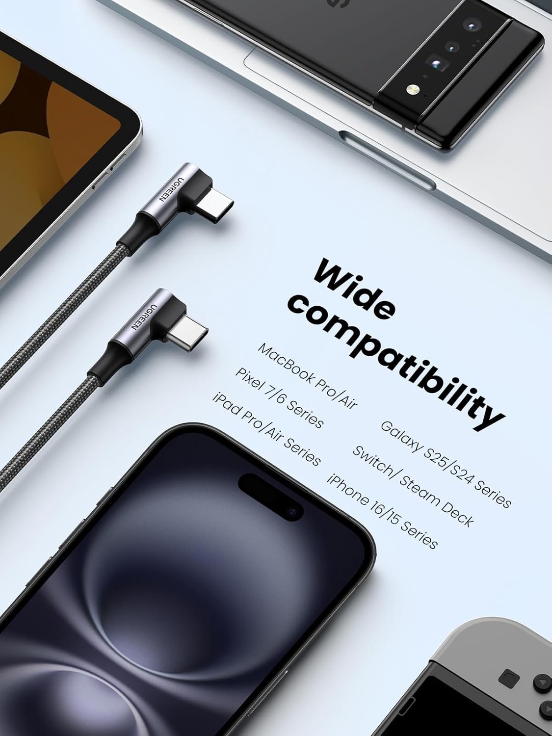 Broad Compatibility: UGREEN USB C to C Cable compatible with iPhone 16 Pro Max/16 Pro/16 Plus/16, iPhone 15 Pro Max/15 Pro/15 Plus/15, Macbook Pro 15″/13″, Macbook, Macbook Air, iPad Pro 2024/2022/2020/2018, Google Pixel 9/8/7/6/5/4, Galaxy Note 10/Note 9/S25/S24/S23/S22/S21/S20/S10/S9/S8, Nexus 6P 5X, NS Switch, Huawei Matebook, Mate 60 Pro, Chromebook, Dell XPS 13, ThinkPad X1, Razer Blade Stealth, ASUS ZenBook 3, HP Spectre notebook, etc.