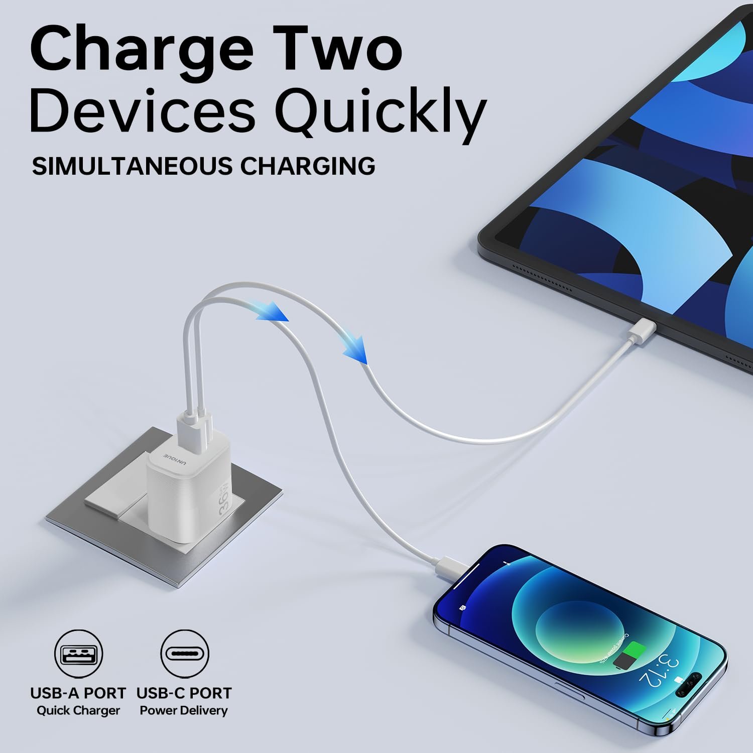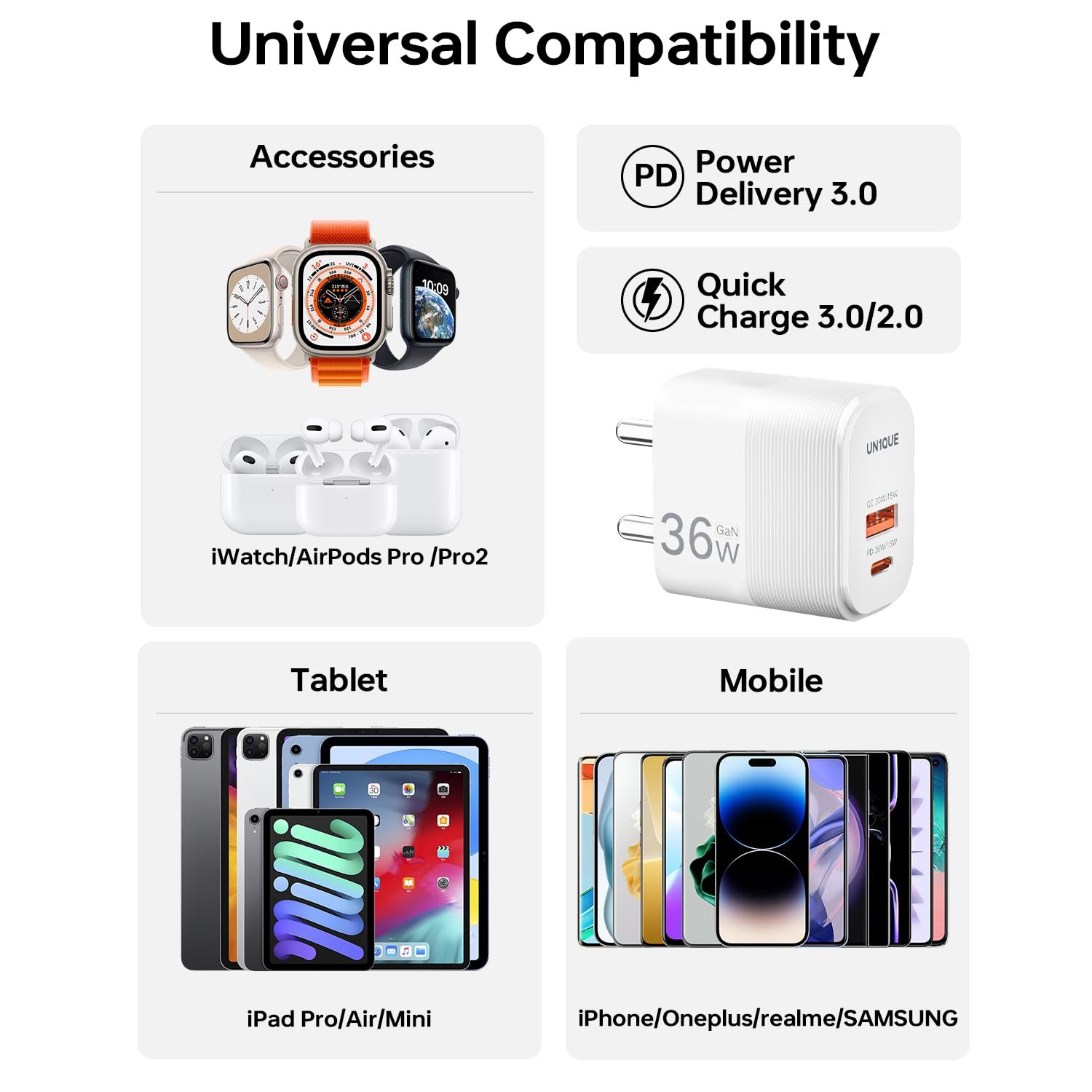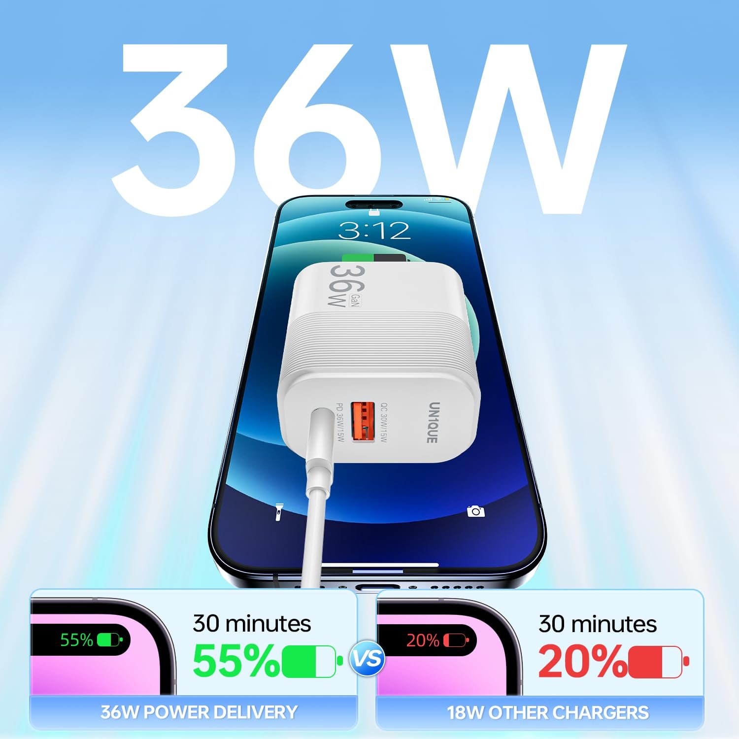 【GaN II Tech】This UN1QUE 36W type c charger optimizes your charging experience with GaN II technology, it is smaller and more compact and gives you even more power.