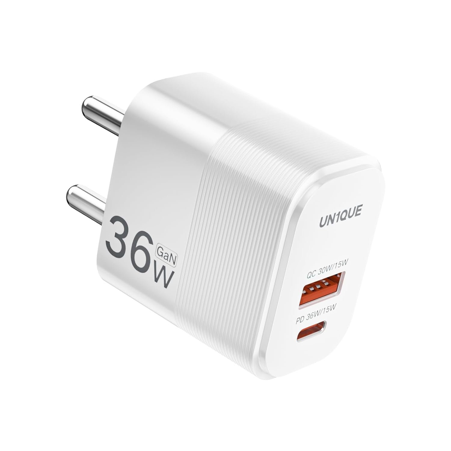 UN1QUE 36W GaN Fast Charger 2 in 1 PD QC Dual Port Type C Adapter, Compact Fast Charger Adapter for iPhone, Samsung, Realme, Xiaomi, Vivio, Oppo, Android, White (36W Charger)