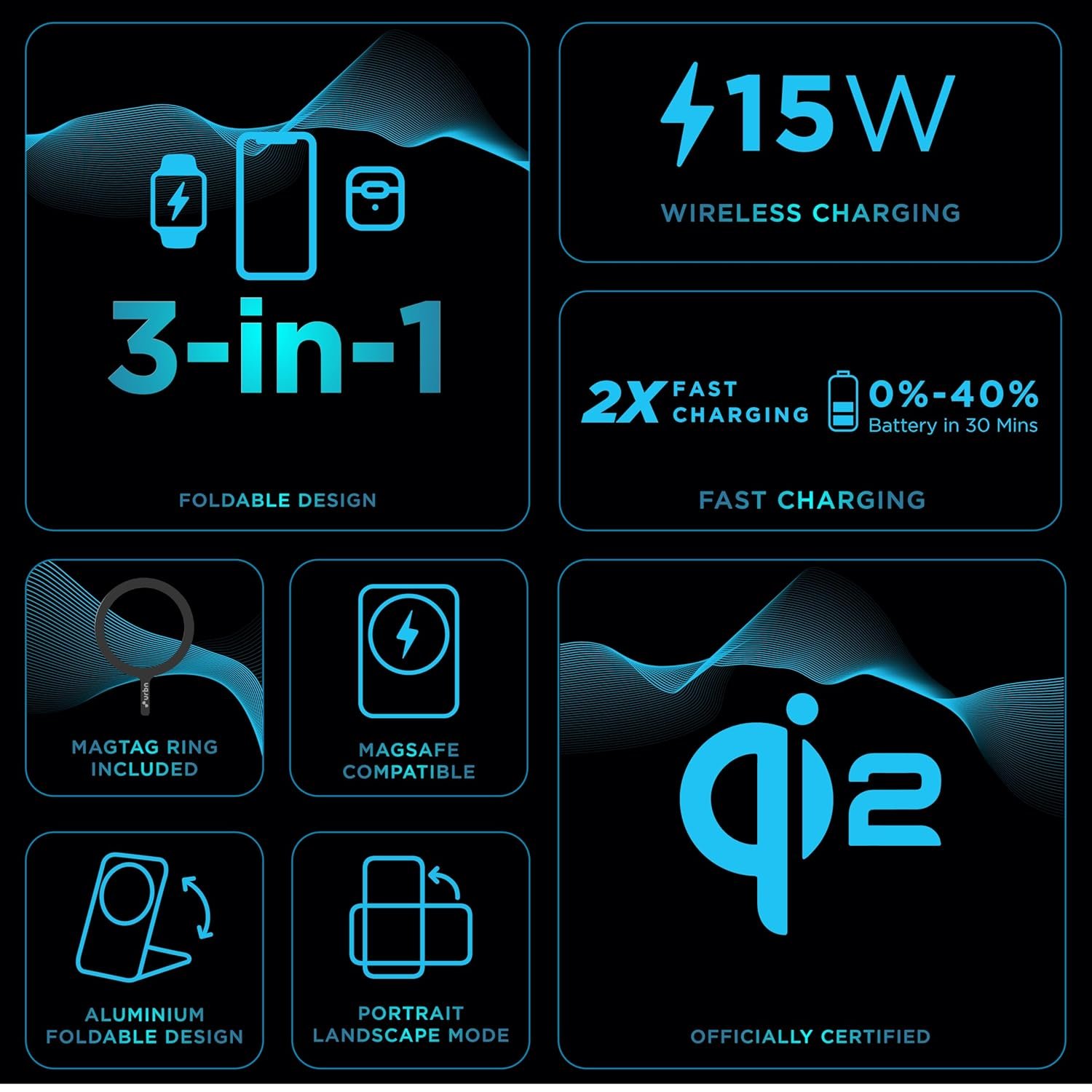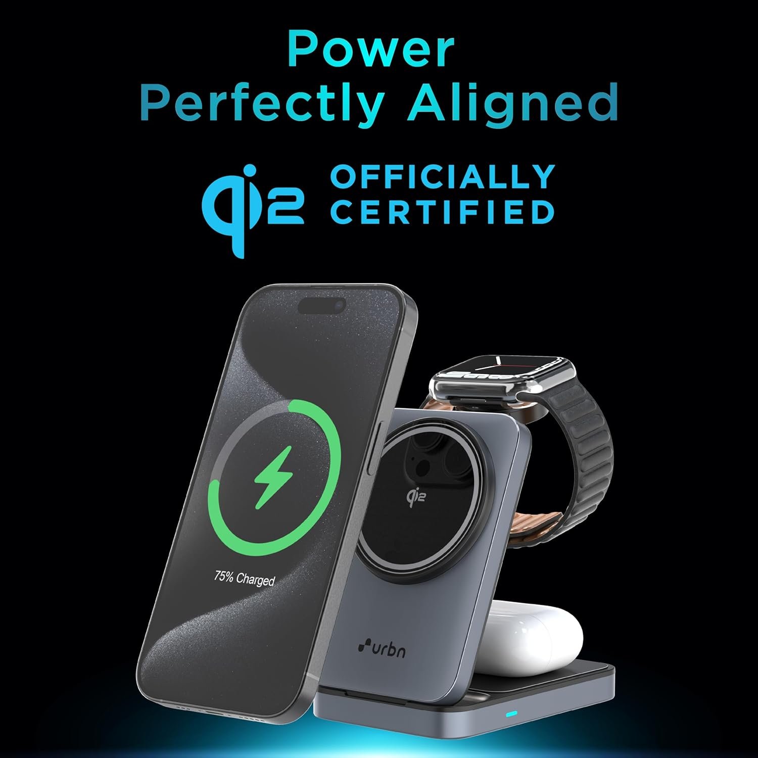 URBN Qi2 Certified 3-in-1 Magnetic Wireless Charging Stand – Your All-in-One Charging Solution! Simplify your life and streamline your charging experience with the URBN Qi2 Certified Wireless Charger 3-in-1 Magnetic Charging Stand. Designed with Apple users in mind and compatible with a wide range of Qi-supported devices, this foldable MagSafe charging stand is perfect for keeping your Apple iPhone, AirPods, and iWatch powered up in style.