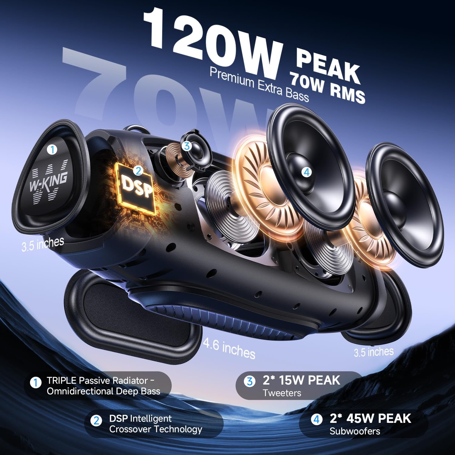W-KING Portable Bluetooth Speaker Wireless,120W Max IPX6 Waterproof Outdoor Loudest Speaker Party Boombox,Triple Passive Radiators-70W Omnidirectional Deep Bass/2 Subwoofer/42H/PowerBank/TF/AUX/Opener