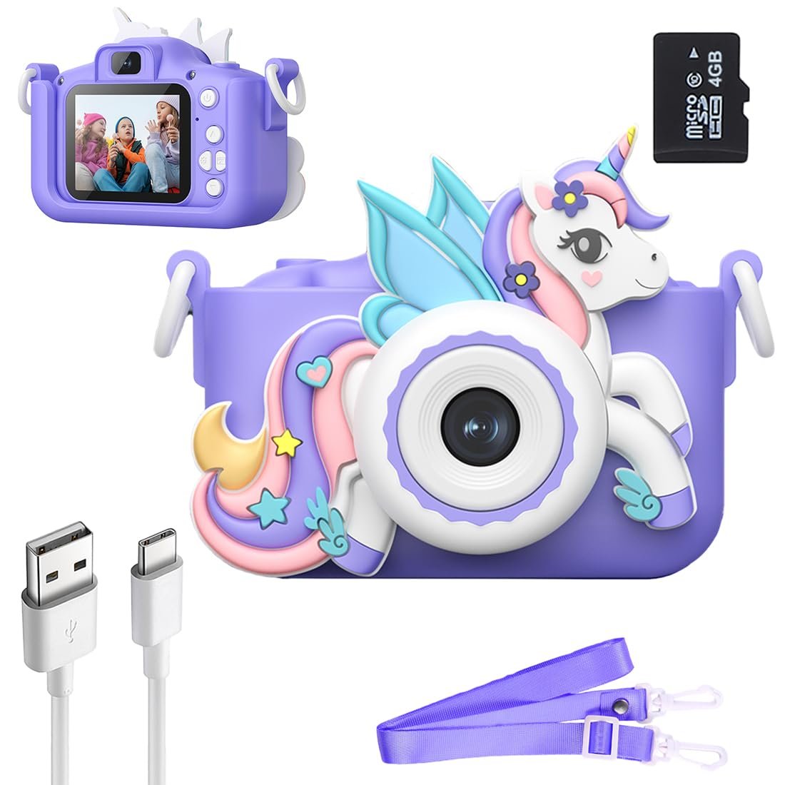 INCLUDED ACCESSORIES: The digital camera for kids comes with a USB cable, a shoulder strap for portability, and a user manual for easy setup. A 4GB SD card is also included, providing instant storage for children to start capturing photos right away. A fun, easy-to-use, and portable mini camera for kids.
