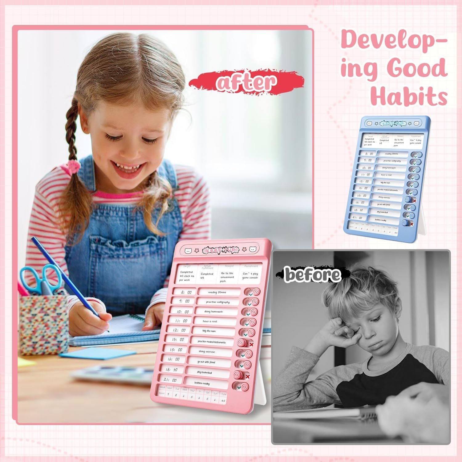 Helps kids manage time & daily tasks with fun clock-in habit tracking system. Reward & punishment system motivates discipline & reduces gaming distractions. Builds focus, efficiency & learning through structured daily routine planner. Cute astronaut design in Blue & Pink makes learning fun for boys & girls. Perfect educational gift to develop self-discipline & good study habits.