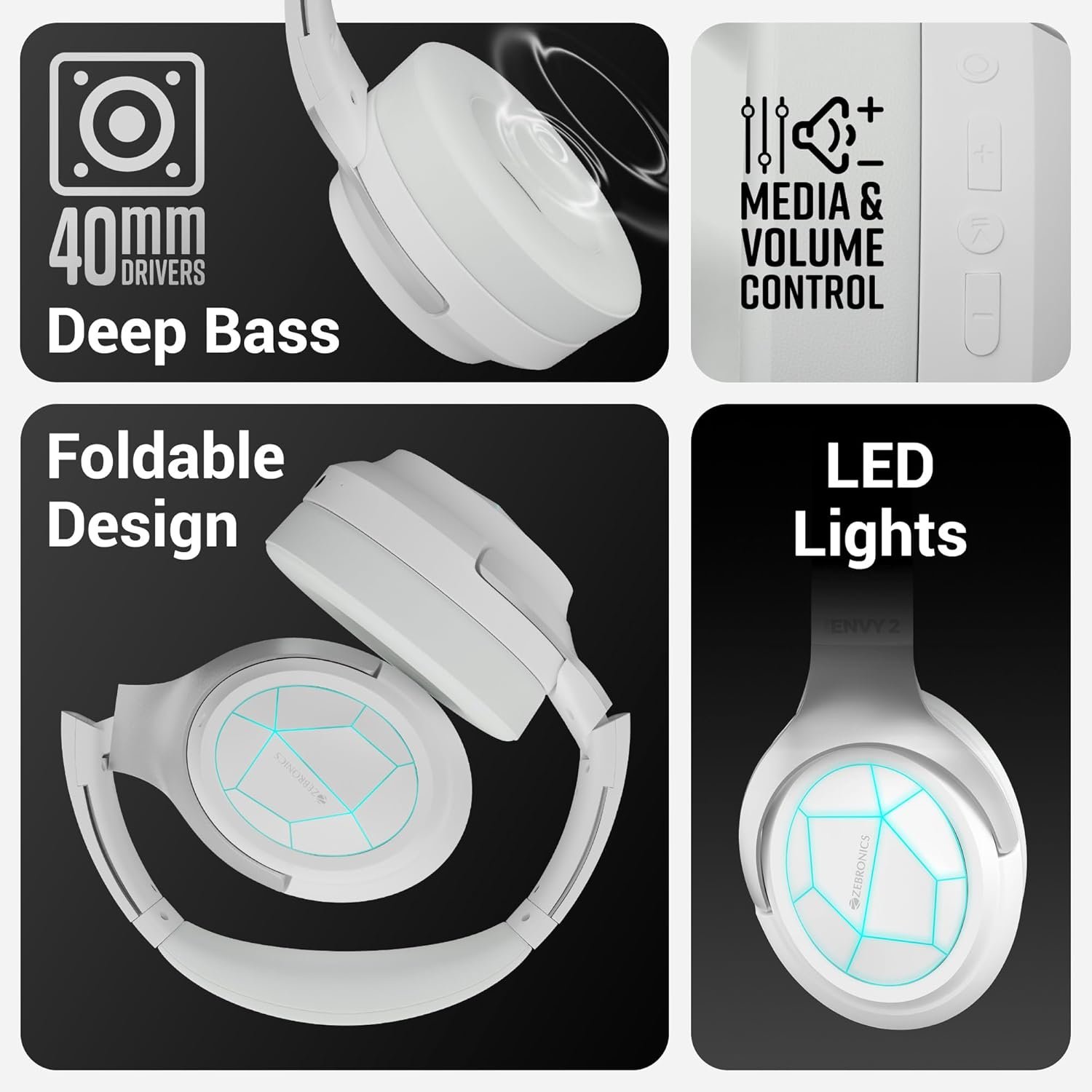 ZEBRONICS Envy 2, Wireless Over Ear Headphone, ENC, Upto 65* Hours Playback, Gaming Mode, Dual Pairing, Bluetooth v5.3, AUX, Call Function, Voice Assistant, Foldable Design, Detachable Mic (White)