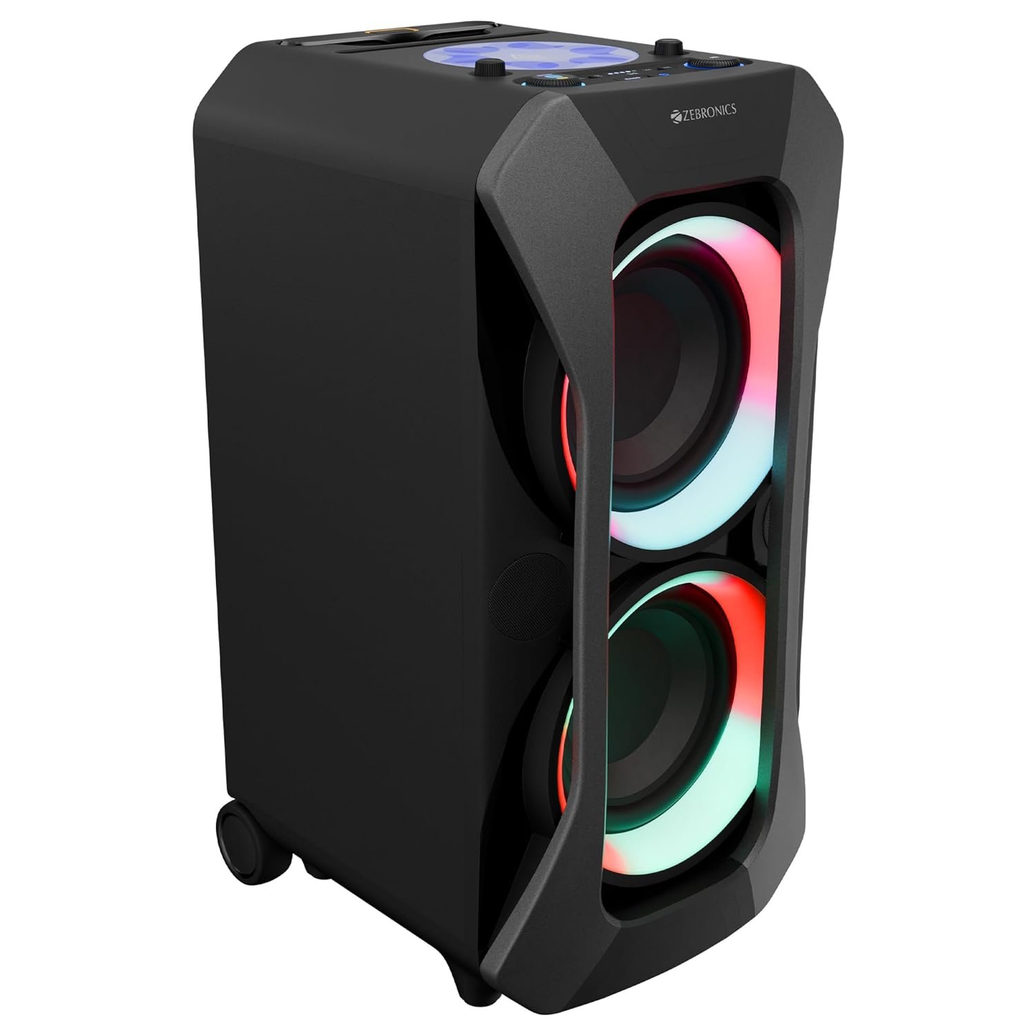 Get ready to elevate your audio experience with the ZEB-Roxor Plus, a powerful 180W RMS DJ trolley speaker packed with dynamic features. Engineered for immersive sound, it boasts dual 20.32cm full-range drivers, Dolby Audio, and AURACAST Technology** (**Compatible only with Zebronics Auracast models) for seamless wireless pairing with compatible Zebronics speakers. Enjoy up to 6.5 hours* of playback (*at 60% volume with LED off) with its built-in rechargeable battery, and control everything with ease using the dedicated app or remote. Whether it’s karaoke night or a live performance, the rechargeable wireless mic and guitar/mic input have you covered. With multi-connectivity options, RGB LED lights, and a trolley design with wheels and a handle, this trolley DJ speaker is your go-to for powerful, portable entertainment.
