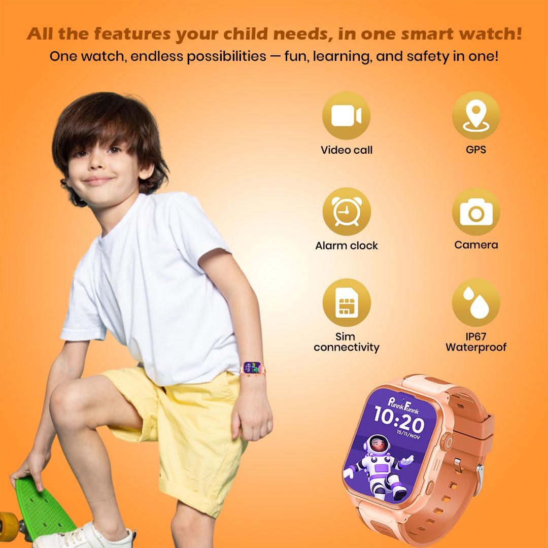 PunnkFunnk Musk Kids Smart Watch 5G/4G with SIM Calling, GPS Tracker, Video Calling, SOS Alerts, Face Unlock, Voice Chat, Games, IP67 Waterproof, 800mAh Battery (Orange)