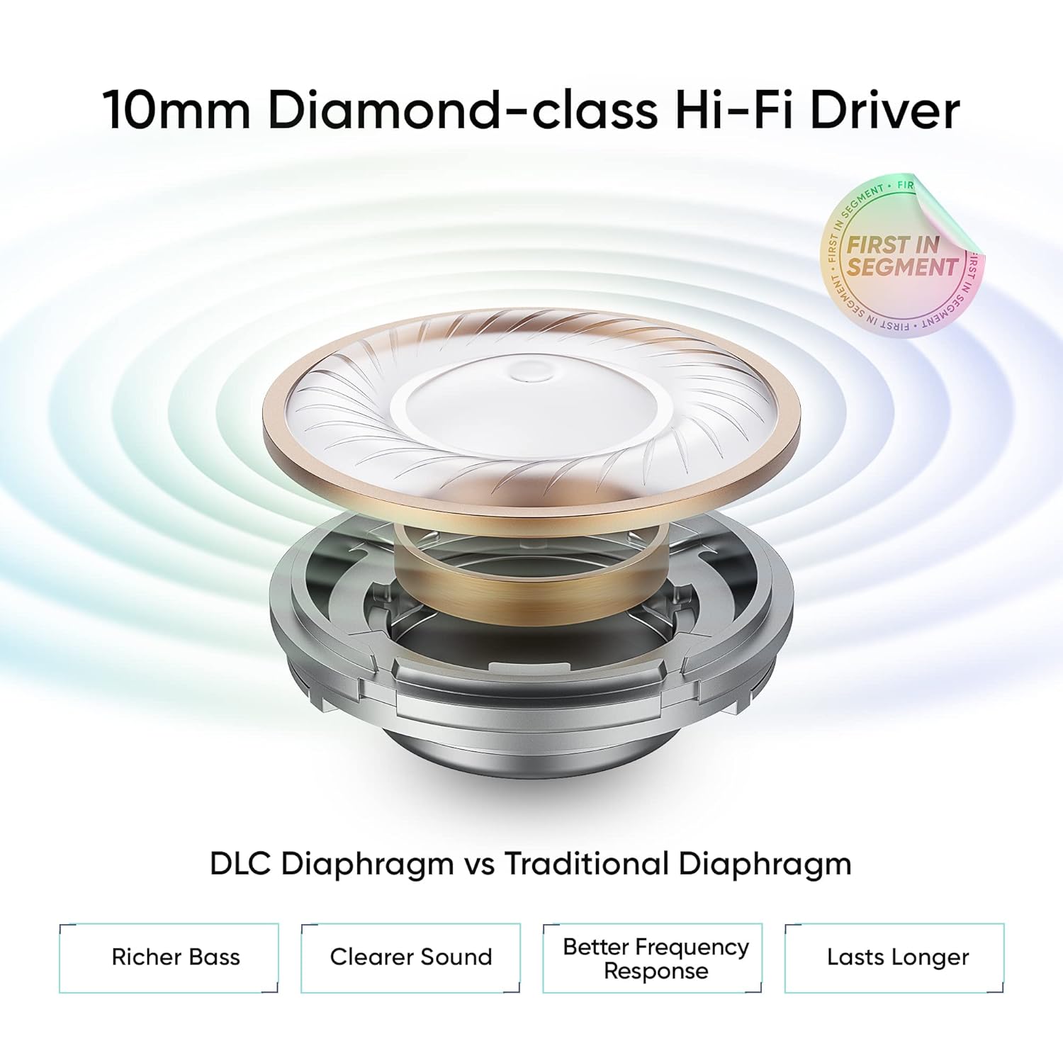 Equipped with a 10 mm large diamond-like carbon (DLC) diaphragm, these earbuds deliver crisp vocals, deep bass, and rich sound quality, taking your music-listening experience to the next level. Moreover, the DLC diaphragm is tough and sensitive, which helps provide an improved sound experience.