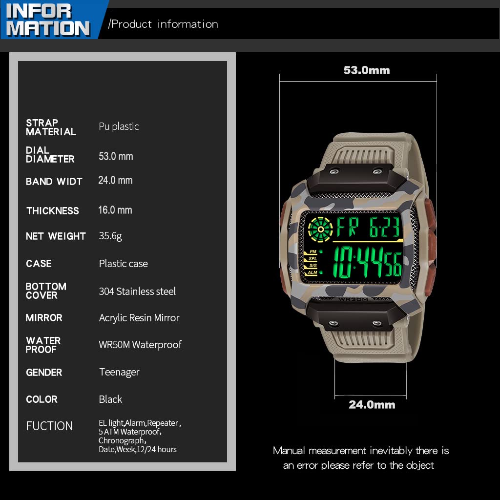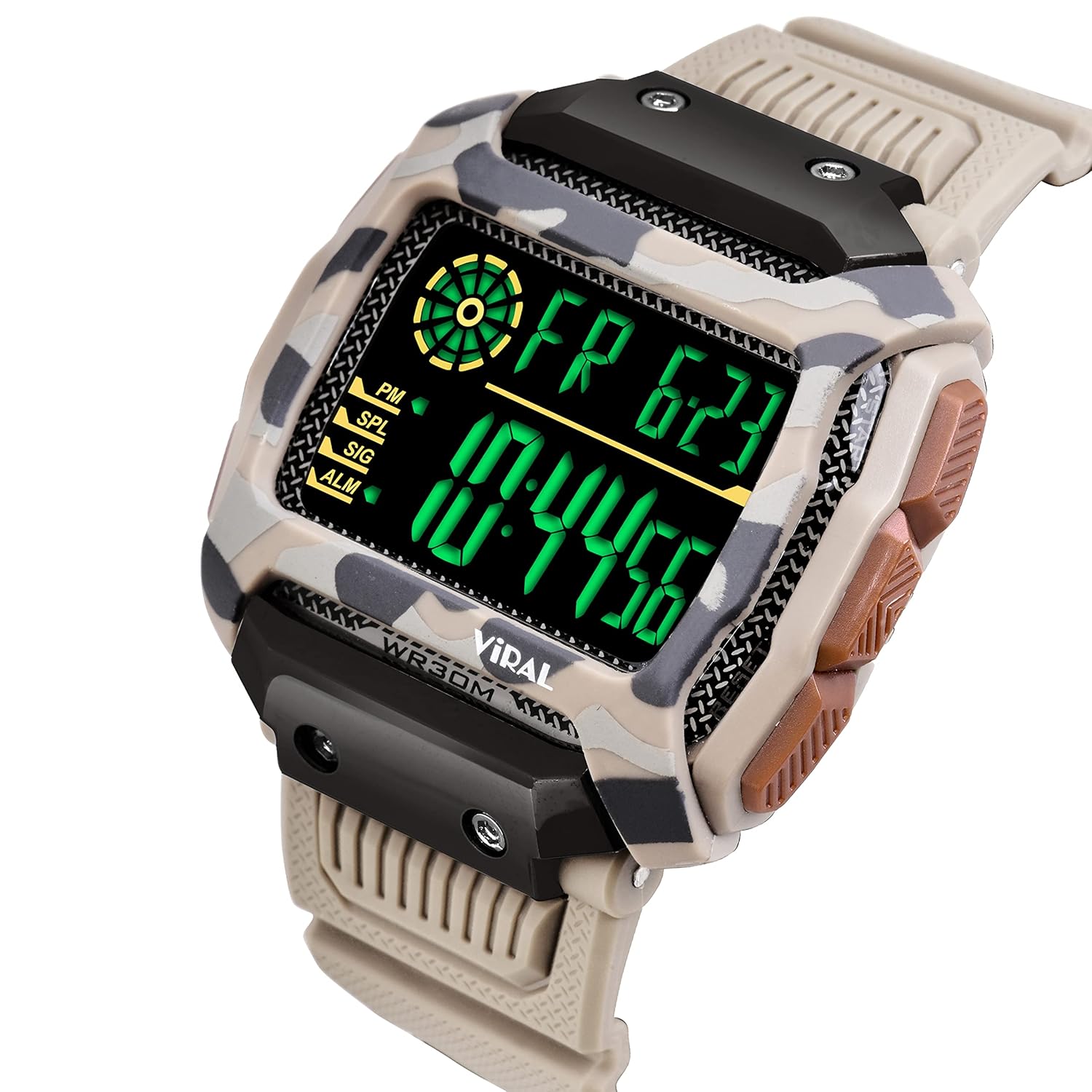 Stay fashionable with Outdoor sports World time quartz watch from Shocknshop available on Amazon. This digital watch has round black dial with Army camouflaged Pattern dial diameter of 53 Millimeters. The Black colored straps in the watch are made of Plastic with rubber coating. The modern digital watch is fast shaping up to be the accessory of the future, rather than a novelty of a bygone era. Dressed up for a business lunch or paired down for a hike in the mountains, the digital watch wears as well as it performs.