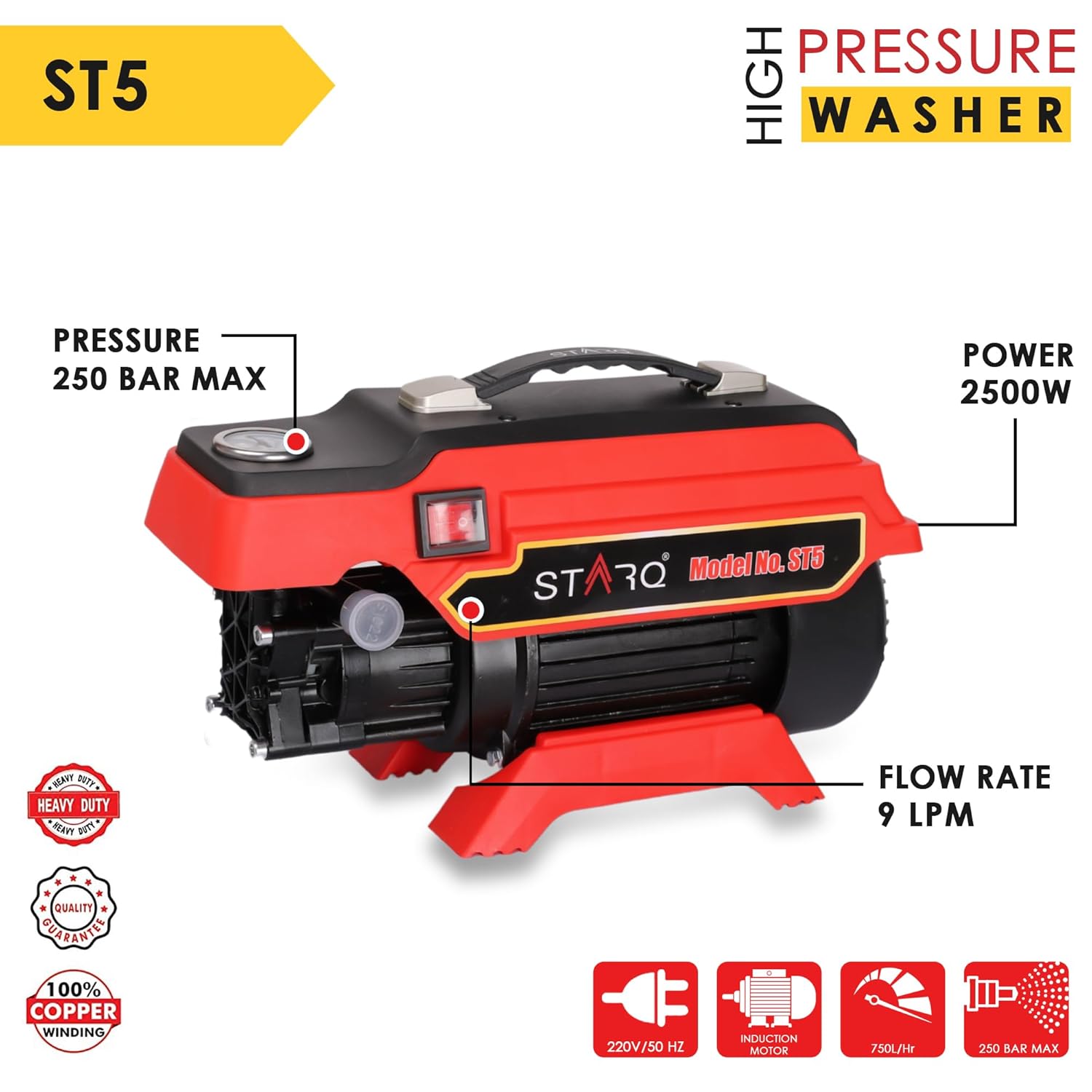 STARQ ST5 | 250 Bar 2500W | Heavy Duty High Pressure Washer for Car, Bike, Home | 1Ltr Professional Snow Foam Lance | Red