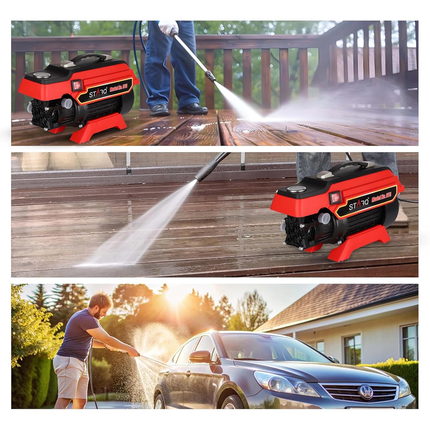 BRAND NEW 2025 MODEL, WATER PROOF: STARQ High Pressure Washer manufactured with 100% copper induction motor, powerful PCB and durable ABS plastic. This allow you to use the pressure washer for a long time. Powerful 2500-Watt induction motor generates 0-250 bar. STARQ High Pressure washers is ideal for quickly and easily removing dirt , such as Car, Bike, AC Servicing, cleaning decks, terraces, driveways, siding, sheds, trucks , boats, outdoor power equipment, solar panels.