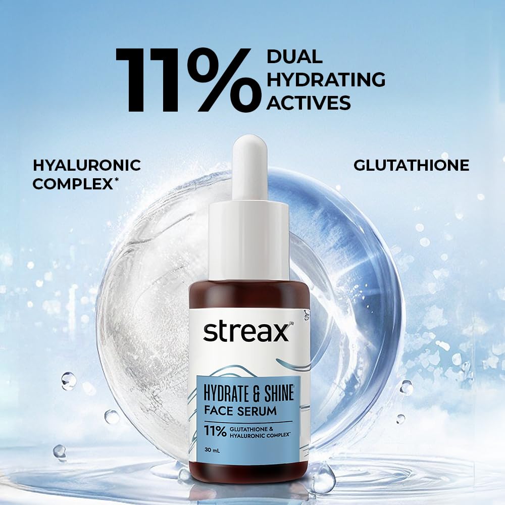 Streax Hydrate & Shine Face Serum, 30ml|11% Hyaluronic Acid|Serum for Glowing Skin |Instant Glow, Deep Hydration & Brightening in 3 Days|Glass Skin Finish|Clinically Tested| All Skin type