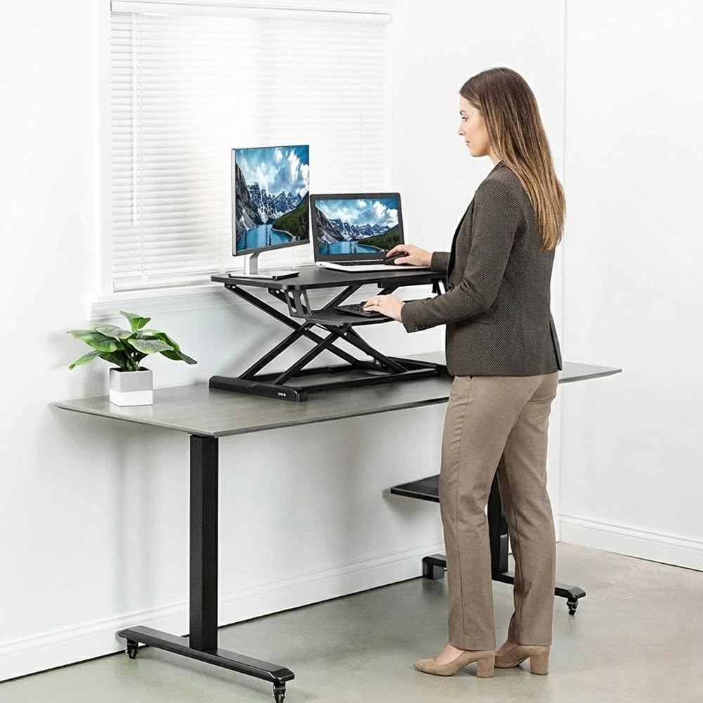 Transform your daily workflow with the Black Standing Desk Converter, a sleek and versatile solution that supports both sitting and standing positions. Powered by a smooth hydraulic lift mechanism, this adjustable workstation lets you find your ideal height and posture—effortlessly.
