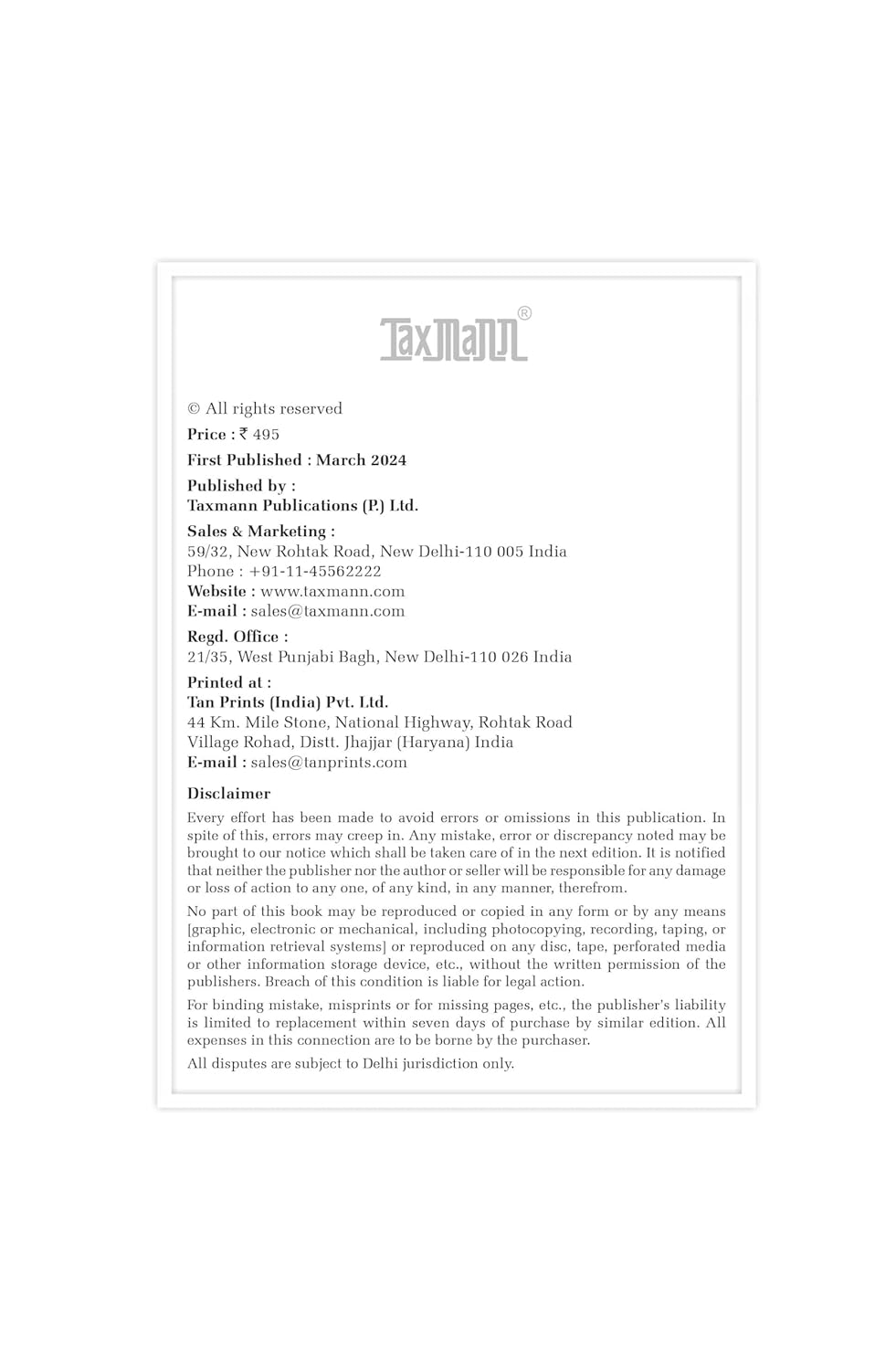Publisher : Taxmann Publications Private Limited; 2024th edition (18 March 2024); Taxmann Publications Private Limited, 59/32, New Rohtak Road, New Delhi-110005, Email Id: sales@taxmann.com, Phone Number: 011-45562222
