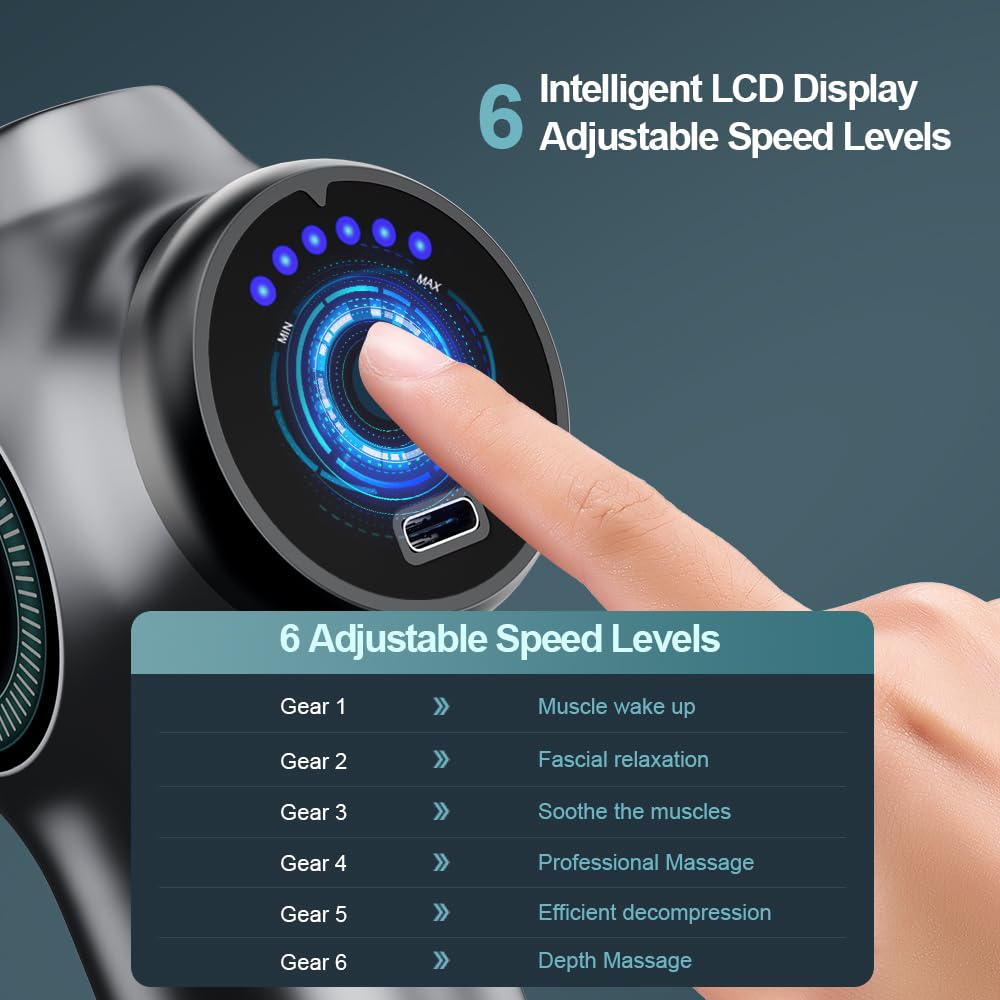 [6 Adjustable Massage Speeds] This body massager gun boasts 6 intensity levels to customize your experience and meets all your massage needs. Hold the button for 2–3s to power on/off. Enjoy deep tissue massage with multiple modes — ideal for sore muscles, pain relief and daily stress relaxation.