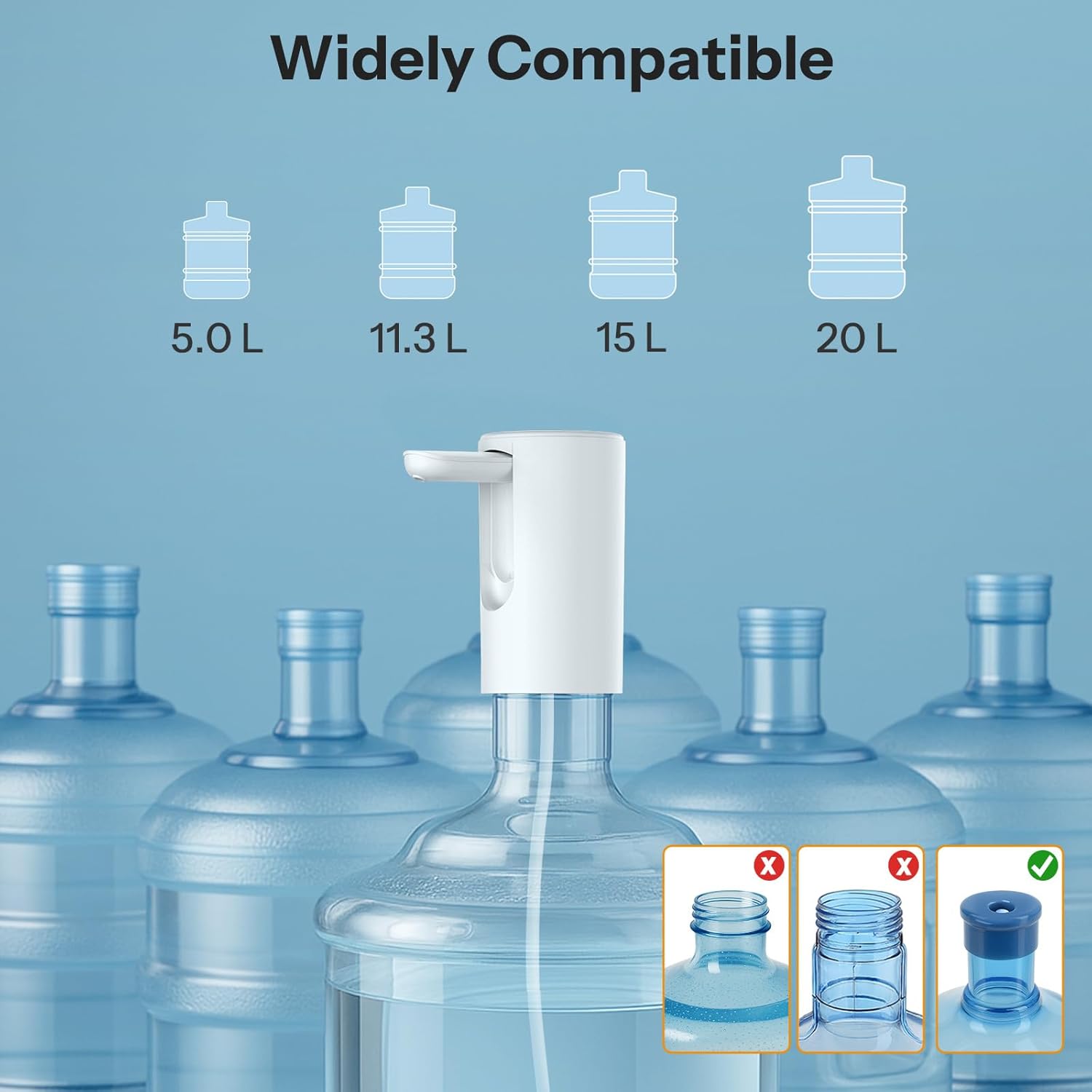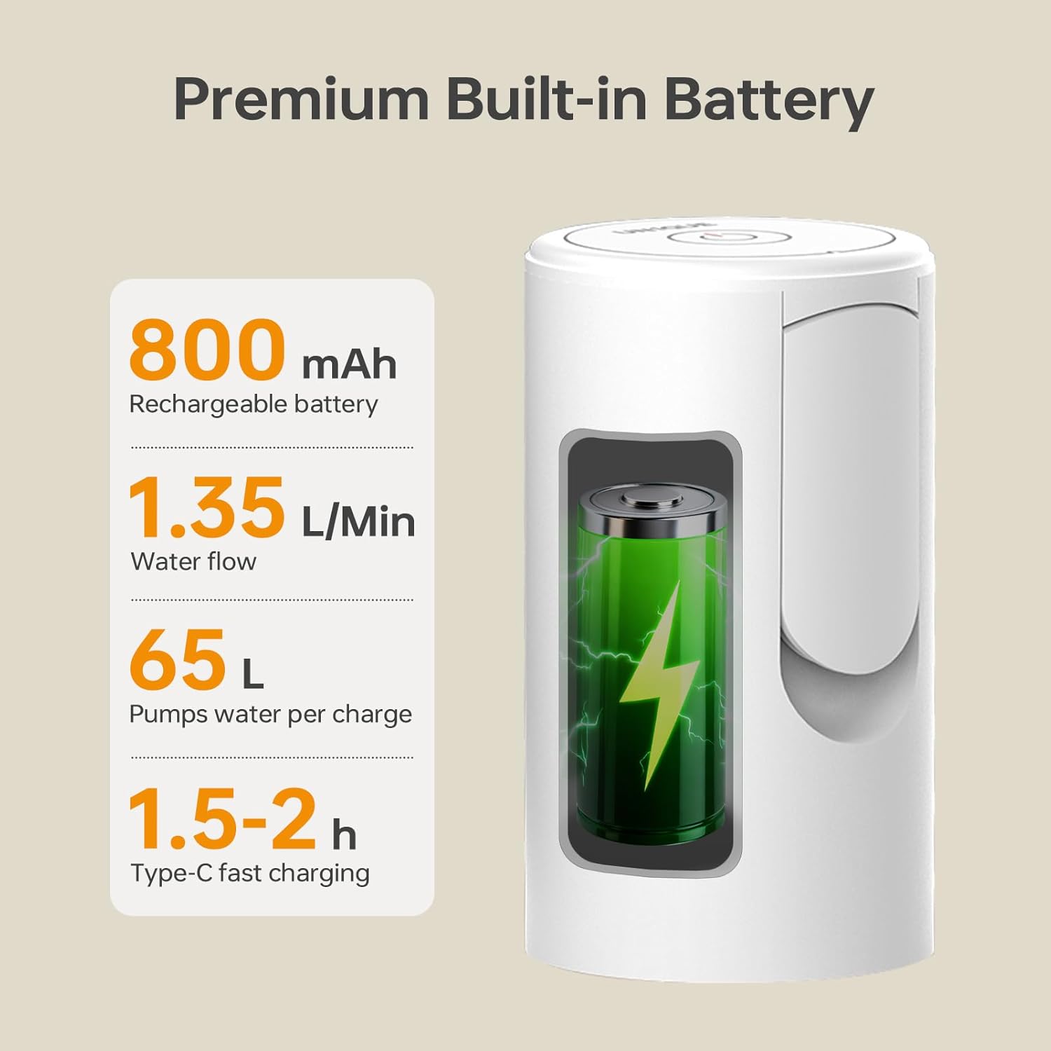 Built-in 800mAh Long-Lasting Battery: This water pump can be used for pumping up to 3.2 bottles of water (20L) per full charge and deliver a faster water flow rate of 1.35L/min, while the universal Type-C port supports adapters, power banks, and USB devices. Charging is hassle free.