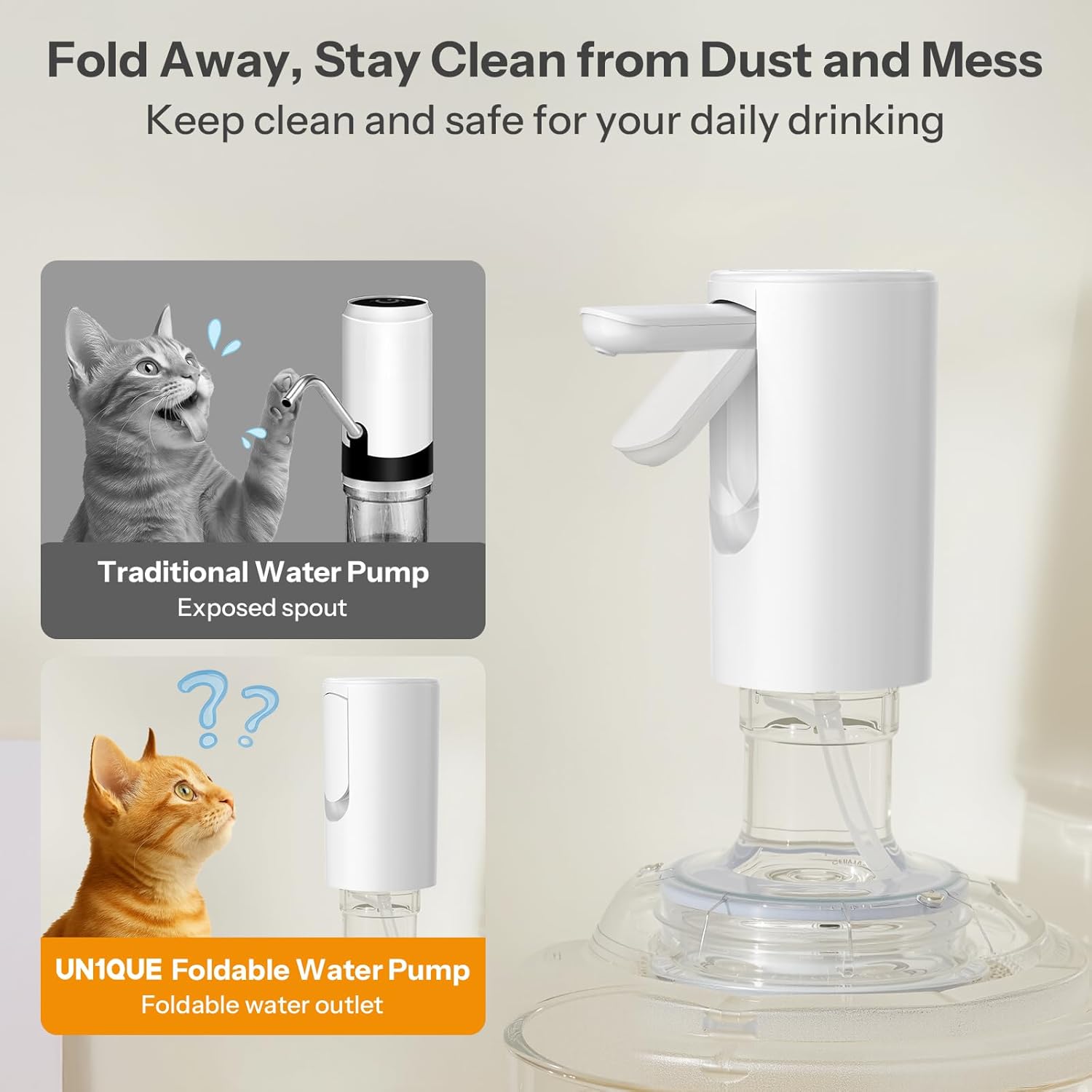 Foldable & Hygienic Design: The foldable design reduces the contact between the water pump outlet and dust, pests and pet germs, making it clean and hygienic, and more reassuring when drinking water. With the powerful motor, our water dispenser pump delivers instant and fresh flow without standing water to ensure each pure drinking.