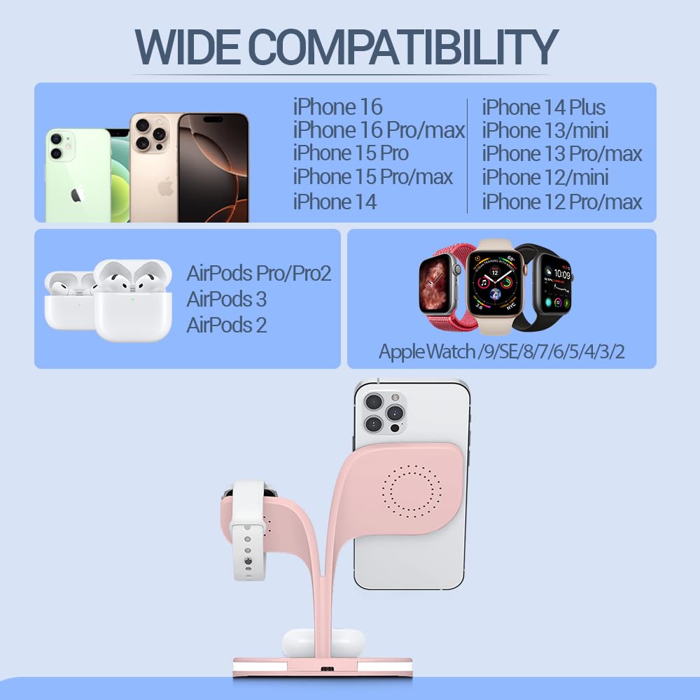 UNIGEN® Magtec 500 4in1 23W Foldable Magnetic Mag-Safe for iPhone 17/16 Plus/17/16 Pro/17/16 Pro Max,15/15 Plus/15 Pro/15 Pro Max,14/13/12 Series, AirPods 3rd/2nd, Series 9/8/7/6/5/4/SE LED Lamp-Pink